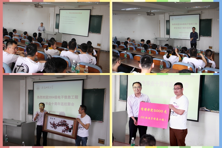 2004级电子信息工程从四面八方返回母校,重温恩师教诲,再叙同窗情缘。一朝离别,赴天南海北;十年聚首,忆青葱岁月。学院党委书记李娟、院长崔执凤、副书记吴长义、副院长郑贤锋、崔光磊及校团委副书记汪凯(04电子辅导员)等应邀出席了聚会活动。