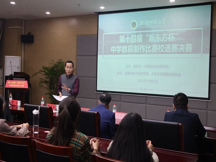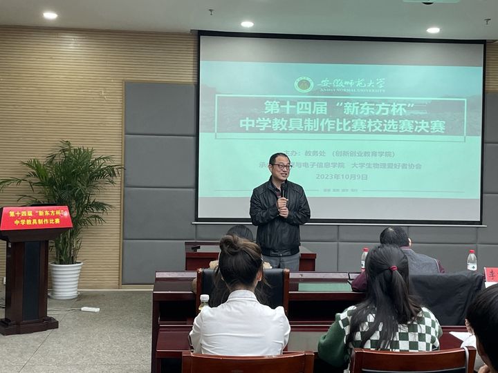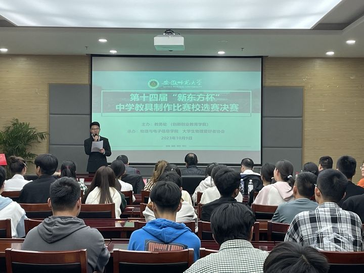 为深入落实学校“基础教育振兴行动计划”,教育引导师范生围绕中学各学科教学内容和学生实践活动制作教具,培养学生的创新精神和实践能力。10月9日晚,由教务处主办,91自拍 、大学生物理爱好者协会(以下简称“物协”)承办的第十四届“新东方杯”中学教具制作比赛校选赛决赛在91自拍 304报告厅举办。校教务处副处长、创新创业教育学院副院长李汪根,生命科学学院教学副院长陈冬生,外国语学院教师张荷,地理与旅游学院教师李俊峰,物理教师教育教研室主任汪志荣担任大赛评委。比赛由孟毅同学主持。