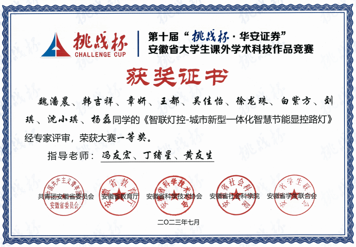 研究生魏潘晨负责的《慧灯“碳”路 ——城市新型一体化智慧节能显控路灯》获安徽省第十届“挑战杯”大学生课外学术科技作品竞赛一等奖并成功入围全国主赛道终审决赛。