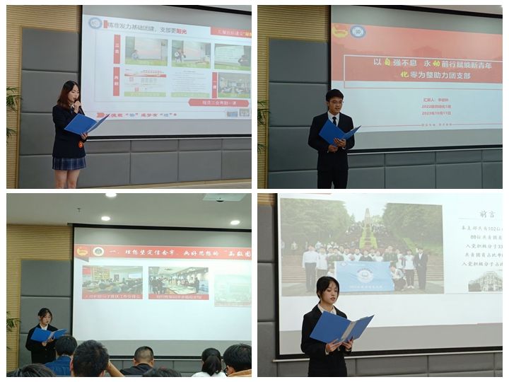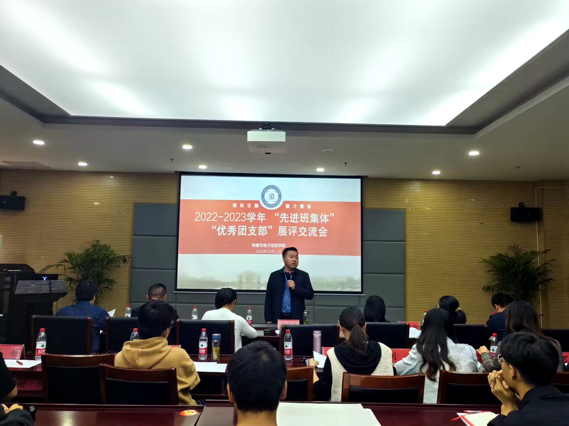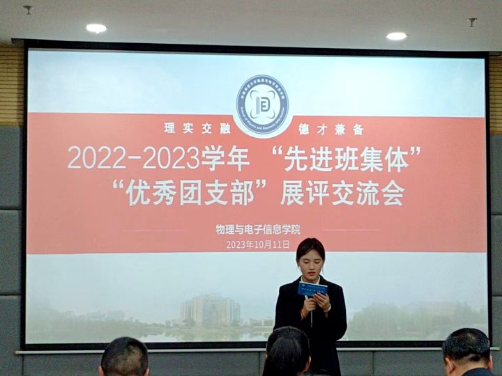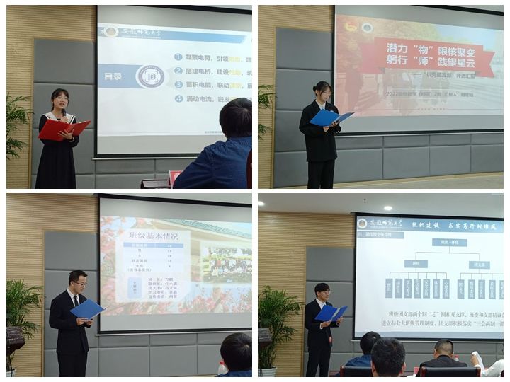 展评会上,13位申报班级、团支部学生代表依次上台汇报,利用演示文稿展示了他们在组织建设,思想引领,实践创新,学风培养等方面付出的努力及取得的成效。电子信息工程2020级1班以“激扬青春电子人,引领创“芯”未来路”为题,讲述101名电子人追求创新、力求卓越的奋斗历程;物理2021级拔尖人才班围绕“拔尖”这一主题,讲述物理学子在学业、科研、竞赛等方面的创建成果;物理学(师范)2022级2班团支部以“函数图”、“强磁场”、“向心力”、“高势能”自喻,展示凝心聚力打造的优秀团支部。各参评集体,立足学院“格物”学生社区采取的创新举措、取得的良好成果得到了评委老师和学生代表的肯定,也赢得阵阵掌声。