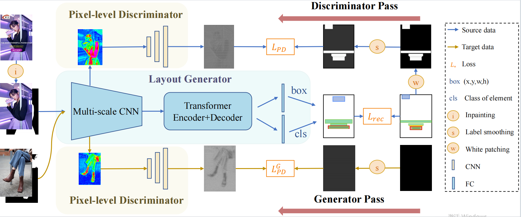 为支撑研究,团队构建了内容感知图文排版数据集(CGL-Dataset),包含60,548组配对的修复海报及标注和121,000张高质量产品图像。这一大规模数据集为图像内容感知图形布局自动化生成研究奠定了基础。由于修复海报与原始图像之间存在明显的域差异(domain gap),研究团队设计了两种创新的模型:CGL-GAN:通过对修复区域施加高斯模糊,学习生成合理的图文排版;PDA-GAN:结合无监督域自适应思想,引入像素级判别器(Pixel-level Discriminator, PD),在浅层特征层面对输入图像逐像素计算对抗损失,从而实现跨域自适应的图像感知排版。此外,研究团队提出了三种全新的内容感知指标,用于衡量模型在捕捉图文元素与图像内容之间复杂关系方面的表现。实验结果表明,PDA-GAN在定量与定性评估中均取得了当前最优性能,能够生成高质量、内容相关性强的广告海报版式。