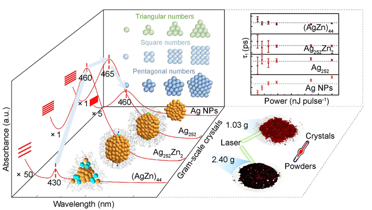 陆洲教授课题组,联合中国科学院合肥物质科学研究院固体物理研究所伍志鲲研究员与庄胜利研究员团队,利用即时生成的银纳米团簇的“反伽伐尼还原”特性还原共存的锌离子,通过合金化增强了银纳米团簇的稳定性,实现了含1796个原子的银-锌纳米团簇(Ag252Zn2)的克级制备,单晶质量达2.40克,产率较已有大尺寸同类材料单晶产量记录提升了两个数量级。在此基础上,团队进一步开发了类似“原子手术”的精准去合金化技术,在不破坏纳米粒子框架结构的前提下,精准移除2个锌原子,成功获得了1.03克具有精确五重孪晶面心立方结构的纯银纳米团簇晶体(Ag252)。研究发现,尽管这两个团簇具有较大的尺寸,并且在溶液里显示了类等离子体吸收,但超快光谱和电子顺磁共振分析表明它们仍处于分子态,尚未进入金属态,说明超快动力学相对于稳态吸收光谱用于判断金属纳米粒子金属性更为可靠。此外,得益于晶体的大量合成,在本工作中还观察到结晶诱导的光热转换增强以及尺寸相关的吸收系数变化。