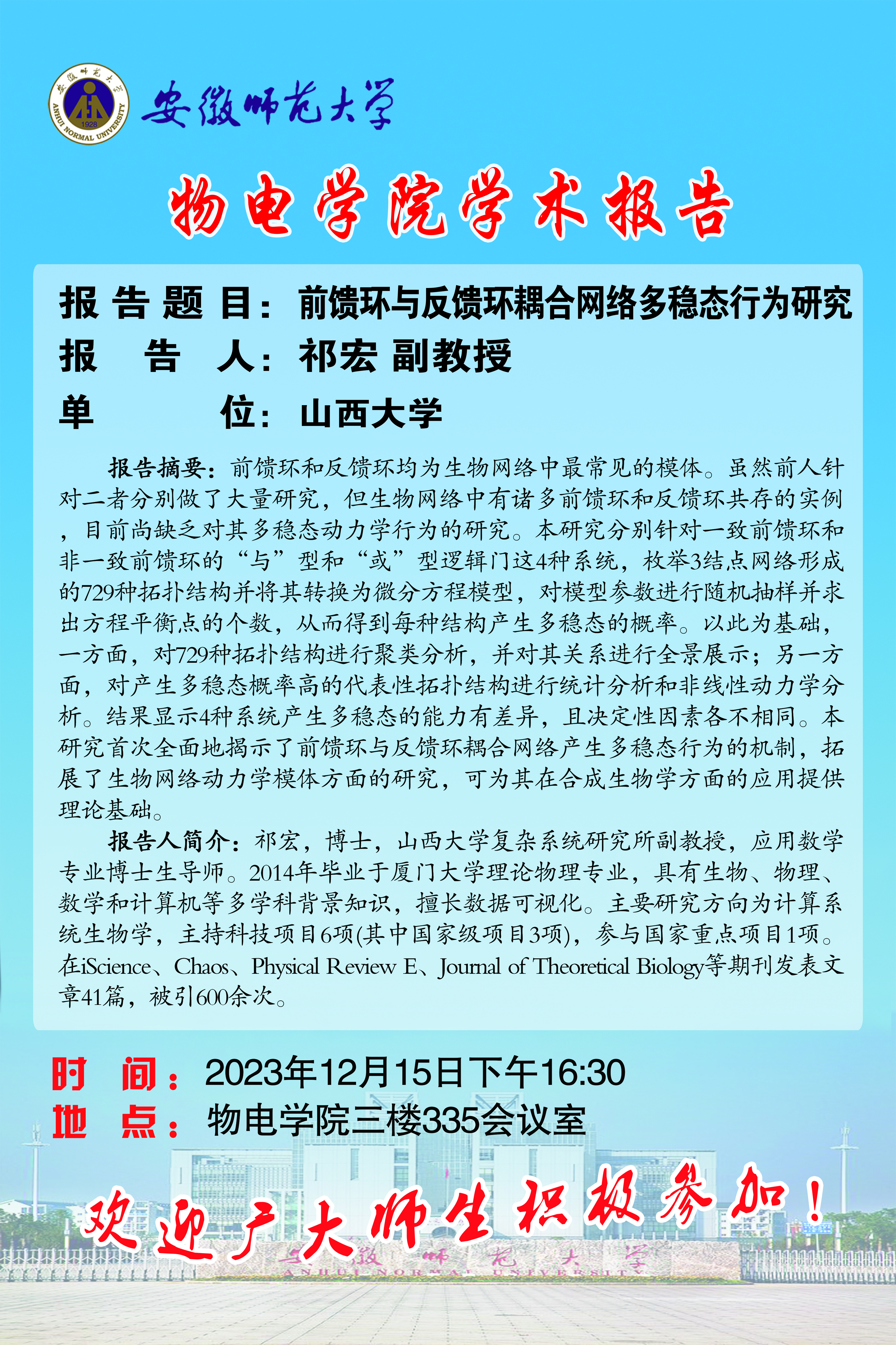 【学术预告】物电讲坛第47期:前馈环与反馈环耦合网络多稳态行为研究