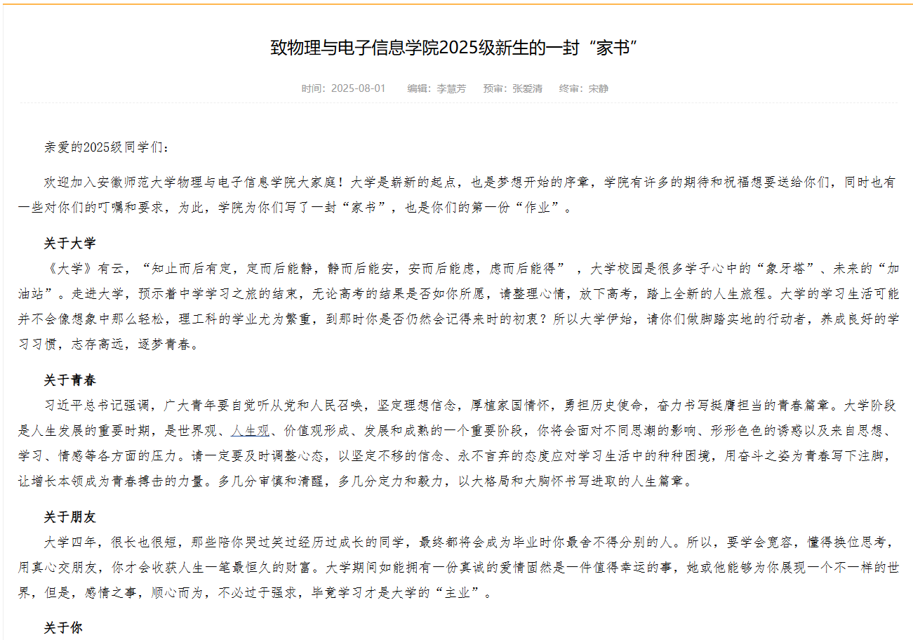 2025级新生的一封“家书”》随录取通知书送至学子手中,既含欢迎与祝福,更藏“大学认知早筑基”的深意。学院提前谋划,在“家书”末附录各专业官方QQ群号。这一举措让新生“未到校、先入班,未谋面、先交流”,提前衔接信息、结识伙伴,为大学认知筑基。家书是关怀纽带,更是入学准备 “启蒙手册”,以指引筑牢适应根基,用期许点亮新征程。