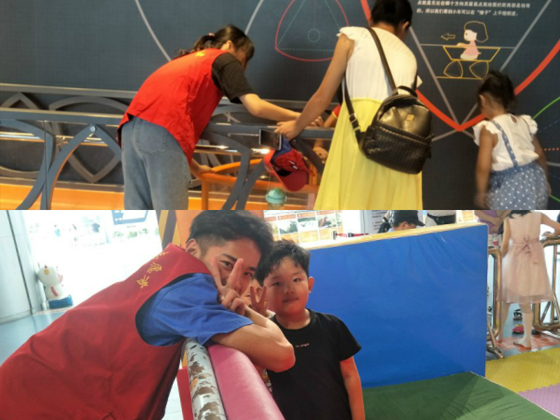 在第一天的工作实践当中,开始,同学们都对自己的工作都有一份新鲜感,但是开始工作之后大家渐渐进入状态。虽然来科技馆参观玩耍的小朋友大多都很调皮,但是志愿者们却很有耐心。而小朋友们也没有对这些大哥哥大姐姐表现出害怕的情绪,反而很乐意的和志愿者们一起交流和玩耍,虽然有时候感觉到累,但是看到孩子们脸上洋溢着笑容,志愿者们心里也是幸福的,便不觉得有那么累。有的志愿者还会在和小朋友玩耍的过程中向他们介绍一些简单的物理知识,小朋友们也对此表现出了浓厚的兴趣。
