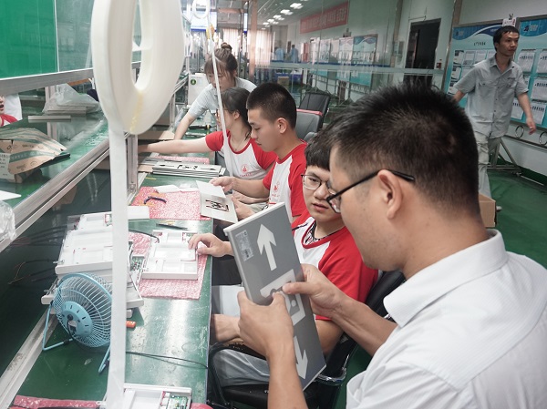 活动伊始,8号生产线张组长开了一个简短的会议,并介绍了该生产线双向双面安全指示灯的生产概况。他提出了详细的工作要求:在保证质量的前提下,提高数量。之后,产线负责人向实践团队演示了部分流程的具体操作,队员们都悉心听讲,并在短时间内掌握了操作的规范技术。