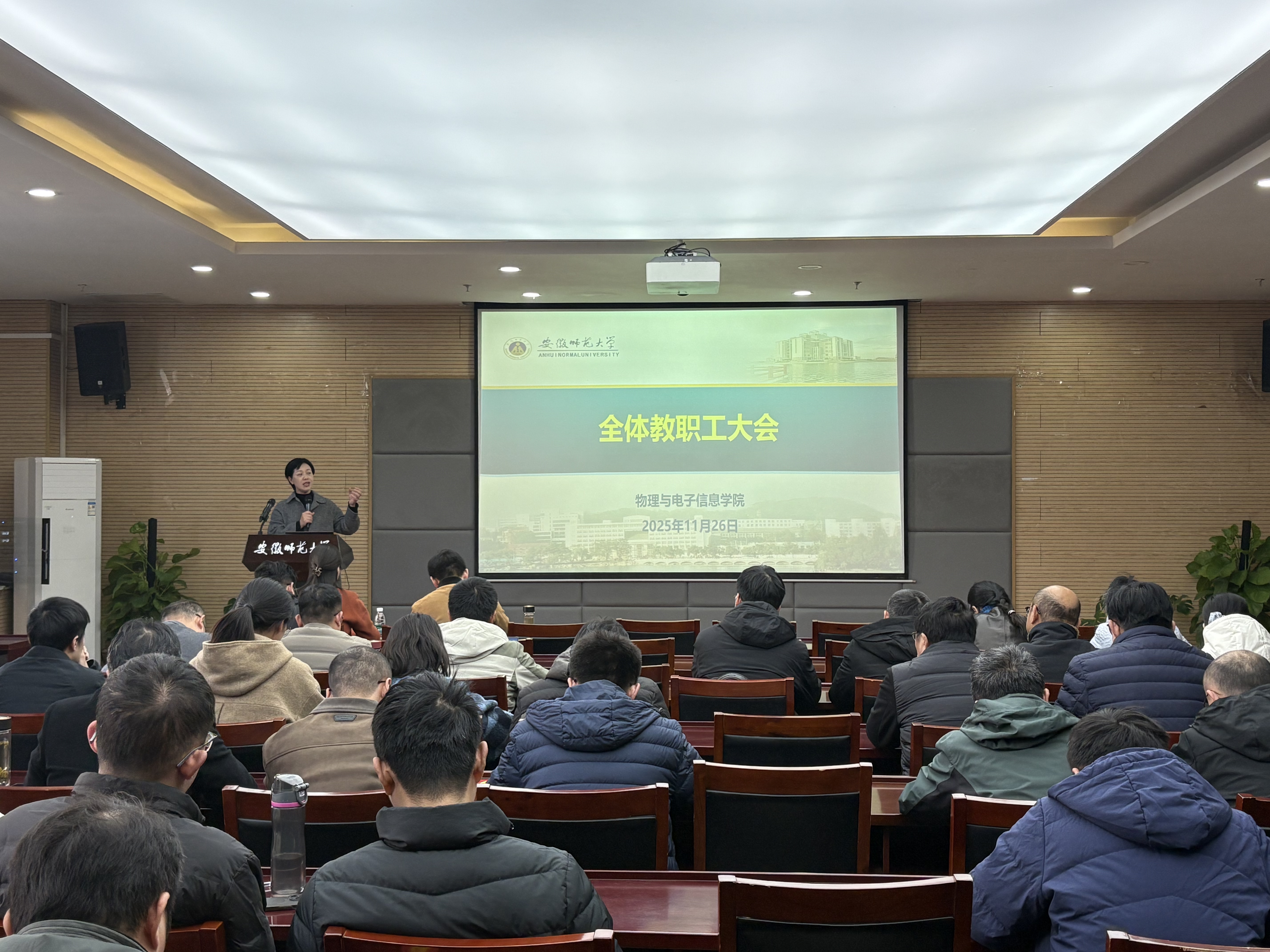 在物理楼304会议室召开全体教职工大会,总结前期工作,布置近期重点工作,学院全体教职工参加会议,会议由学院党委书记宋静主持。会议邀请校审计处处长喻娜开展审计工作培训和师德师风警示教育。